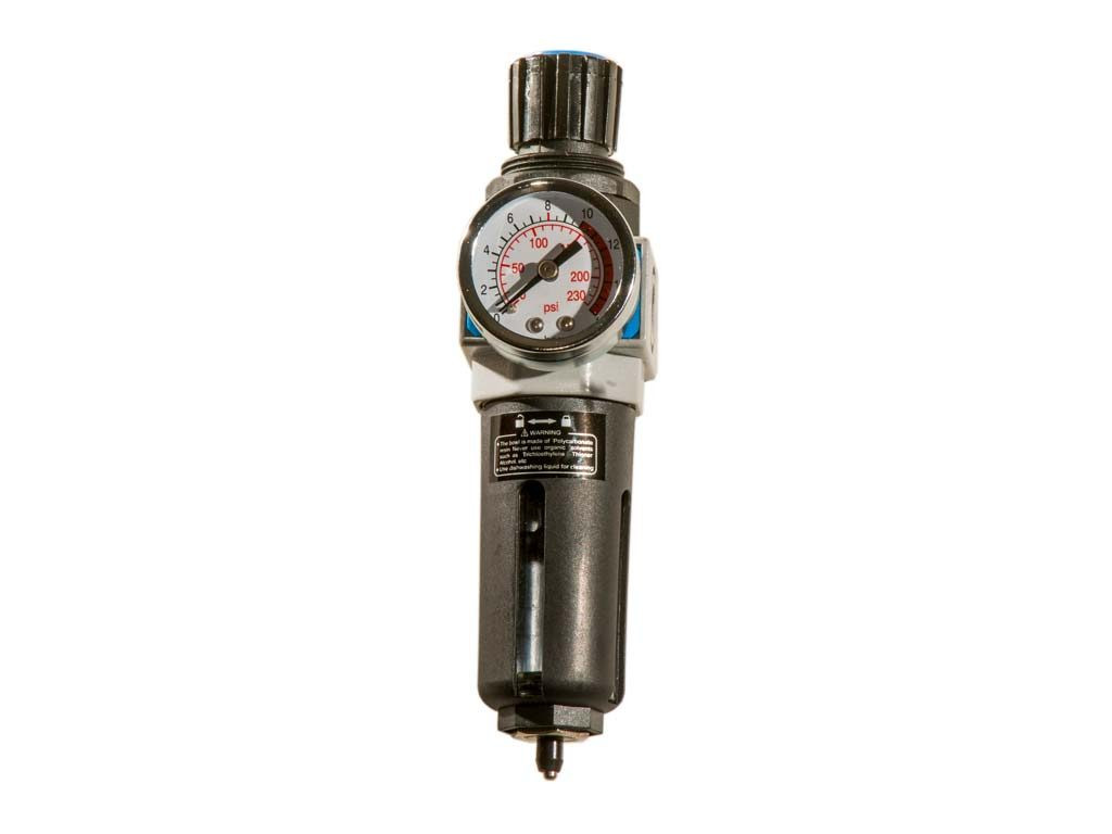 Kiváló minőségű beépíthető levegő előkészítő egység pneumatikus szerszámokhoz.Vízleválasztó-szűrő / nyomásszabályzóBemeneti, kimeneti csatlakozó: 1/4″Szűrőbetét: 25um (25 mikronos)Max. üzemi nyomás: 10barMax.nyomás: 15barÜzemi hőmérséklet: 5-60°CKicsi, kompakt egység. Könnyen telepíthető és kezelhető.A vízelválasztó szűrőben beépített lefolyó szett található, mely lehetővé teszi, hogy egy mozdulattal üríthető legyen a tartály.Megbízható és érzékeny nyomásszabályzó szeleppel és mérőórával felszerelt.Az olajzó nyílása állítható a különböző kenési követelményekhez.Könnyedén össze és szétszerelhető. A hátulján 2db rögzítőfurat található.Az egység részei:1- víz leválasztó és szűrőA pneumatikai vízelválasztó szűrő feladata, hogy a szilárd szennyeződéseket és a kondenzátumokat eltávolítsa a sűrített levegőből. A leeresztő szelepre csatlakoztatott műanyag cső segítségével automatikusan elvezeti a kondenzátumot a nyomás megszűnésekor.2 – nyomásszabályzó szelepA nyomásszabályozó szelep feladata a kimeneti nyomás (szekunder nyomás) állandó értéken tartása, a bemeneti nyomás (primer nyomás) valamint a levegőfelhasználás változásaitól függetlenül. Nyomásmérő órával ellátott (0-16bar / 0-230psi)Csomagolás: 220x55x55mm-es kartondoboz