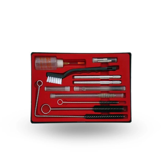 Kiváló minőségű, praktikus pisztoly-tisztító készlet a tökéletes tisztataságért.A készlet többféle méretű keféket, tűket, szilikon - mentes olajat tartalmaz.
