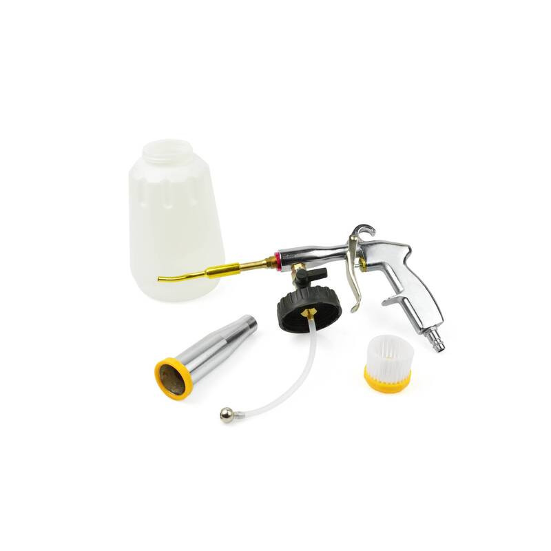 Autó kárpit tisztító pisztoly. Lehetővé teszi az összes autófelület gyors és egyszerű tisztítását. Néhány másodpercen belül tisztítja és szárad. Kompresszorral kombinálva lehetővé teszi olyan helyek elérését, amelyek nehézkesek a hagyományos kézi tisztításhoz. Ezzel a pisztollyal le lehet takarítani a szőnyegeket, az autó belsejét, a műanyag felületeket stb.